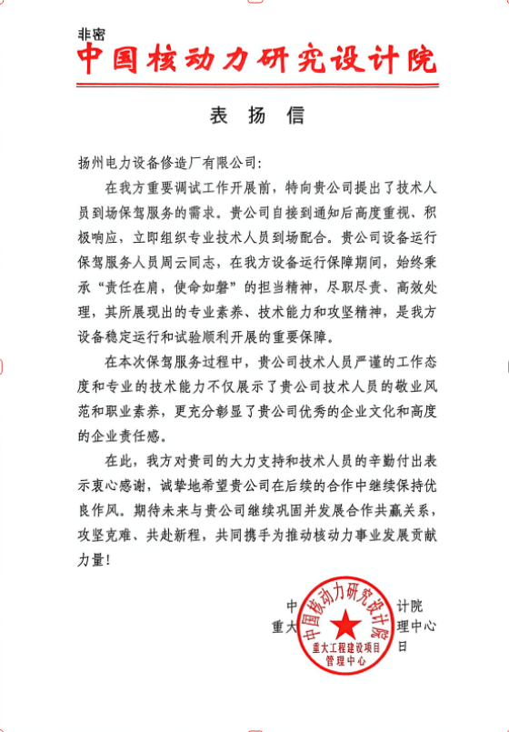 我司收到中國核動力院表揚信